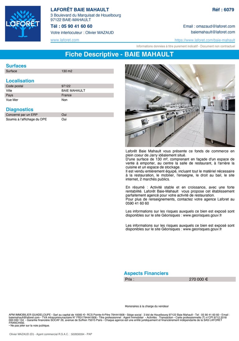 Fonds de commerce restauration à vendre à Jarry | Laforêt Baie Mahault