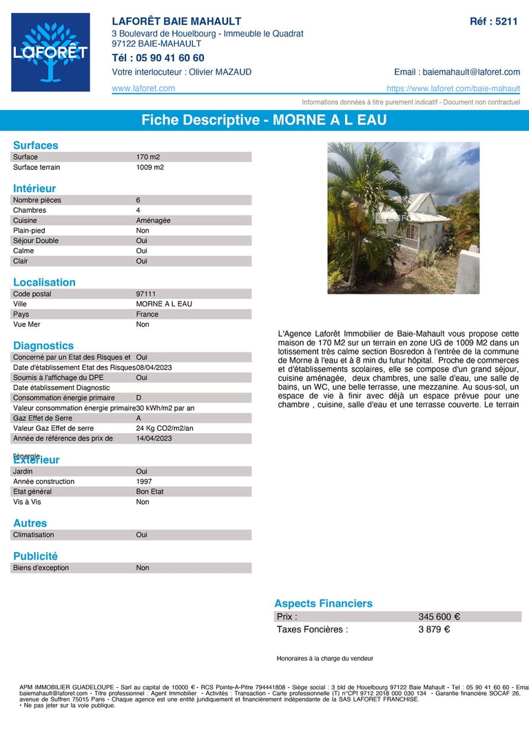 Maison de 170 M2 sur terrain arboré en zone UG - Agence Laforêt Immobilier Baie-Mahault